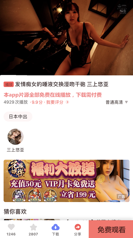 每天可以白嫖三部作品,建议大家开通VIP,解锁VIP专属内容和加速通道以及下载功能,送的金币还可以参加捕鱼牛牛炸金花等,支持提现,分分钟回本~